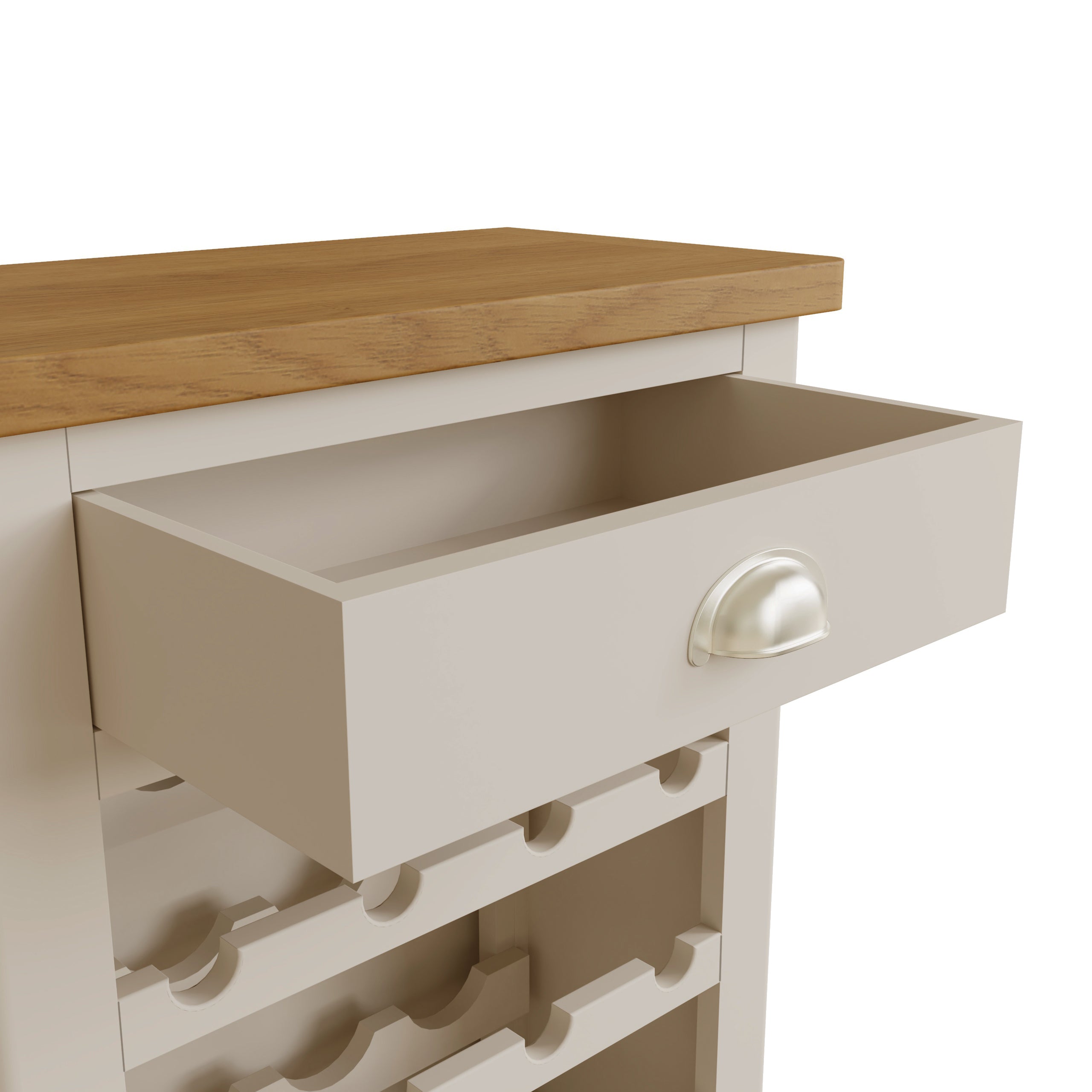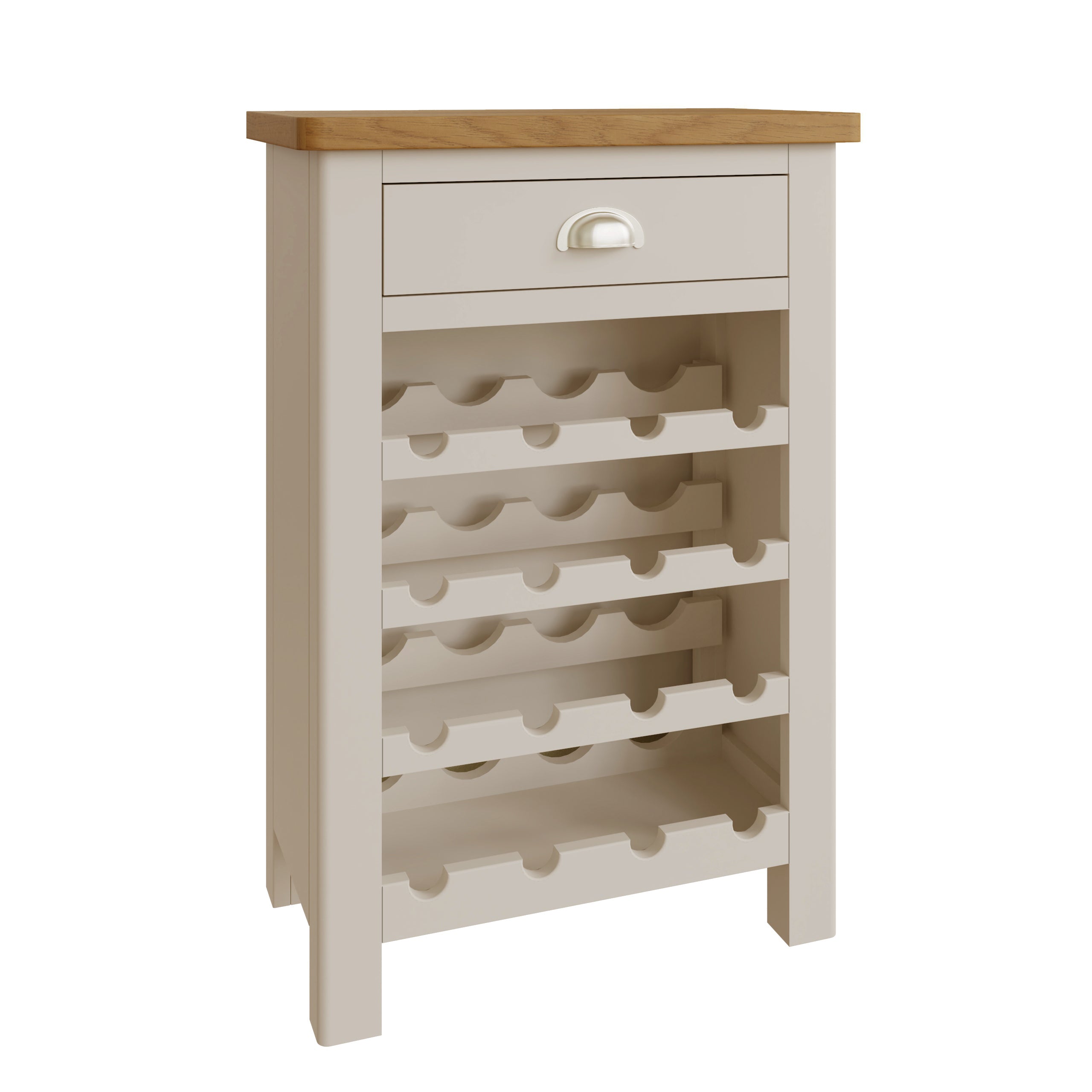 The top is made entirely from specially selected oak and the cabinet has been flawlessly Oak & Stone Painted.This popular wine rack has a 16 bottle capacity and features a full width accessory drawer. The lacquered oak top can be used for serving or display.